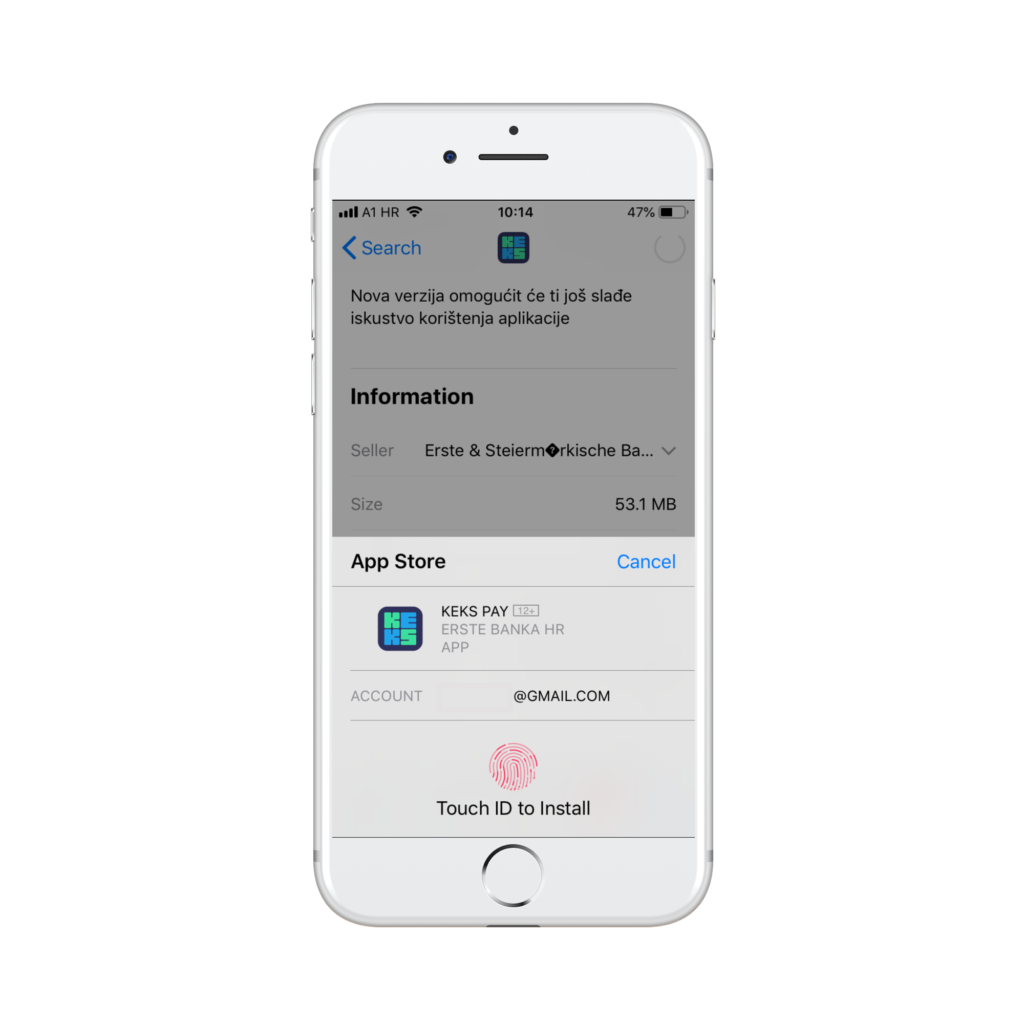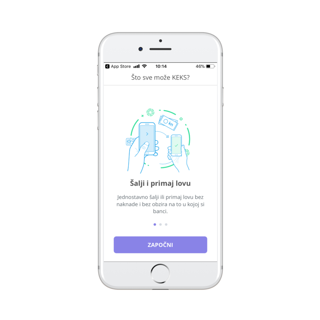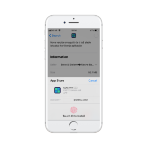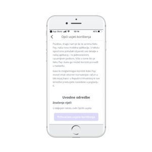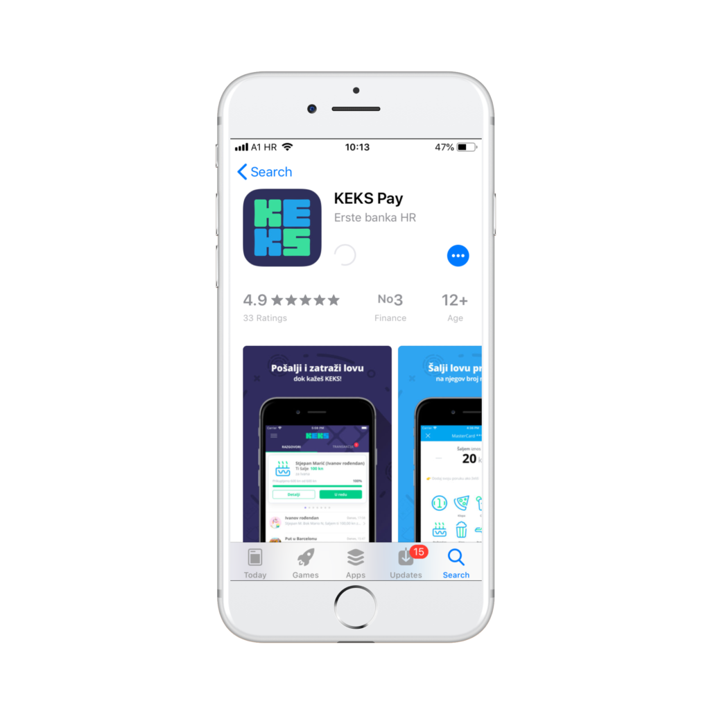Idite u App Store i u tražilicu upišite KEKS Pay. Pritisnite na oblačić za preuzimanje, slijedite korake instalacije i pričekajte.