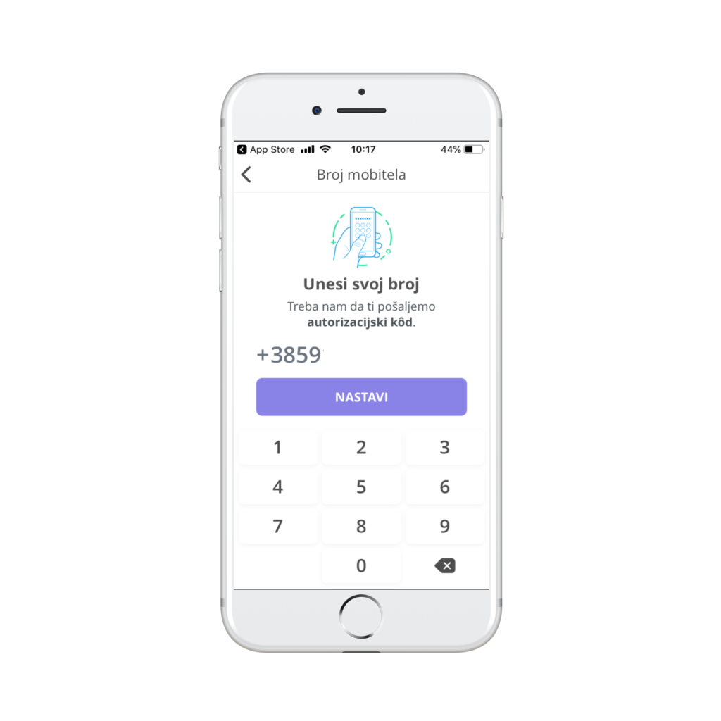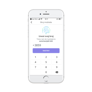 Slijedi unos broja mobitela na koji ćete zaprimiti autorizacijski kod. Broj se unosi u obliku +3859XXXXXXXX.