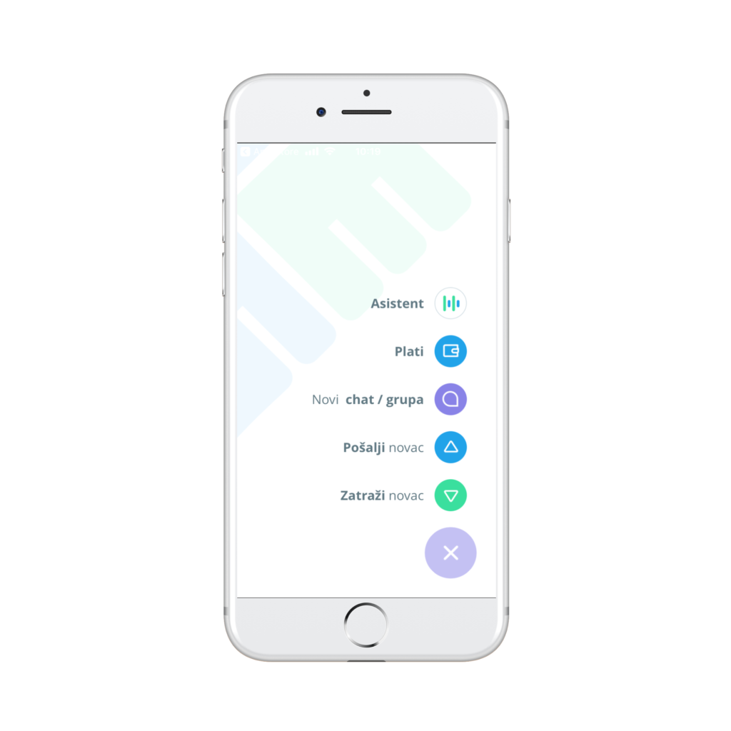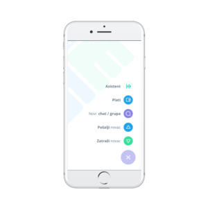Pritiskom na znak + u donjem desnom dijelu ekrana otvara se izbornik s: Asistentom, opcijom Plati, Novi chat/grupa za razgovore i grupno skupljanje novca za poklone za prijatelje i slično, zatim opcija slanja novca Pošalji novac i opcija primanja novca Zatraži novac.
