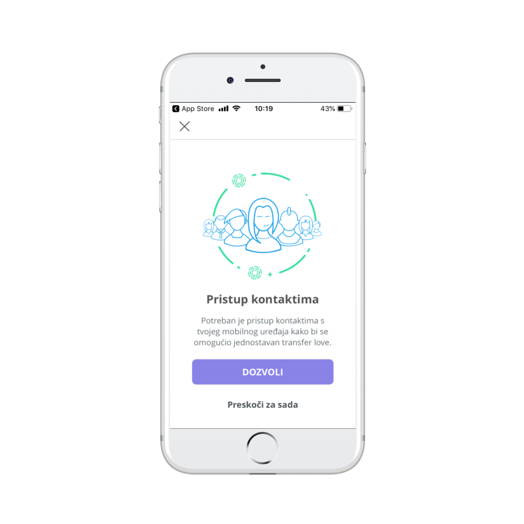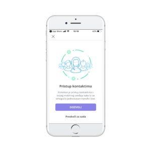 Kako bi se omogućio transfer novca, potreban je omogućeni pristup vašim kontaktima iz telefonskog imenika. Međutim, ovaj korak možete preskočiti i ručno unijeti broj mobitela s kojim ćete raditi transfer.