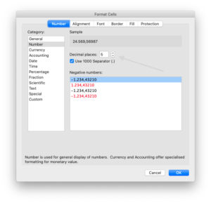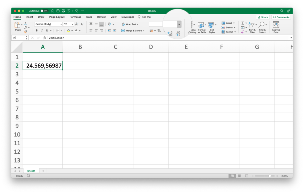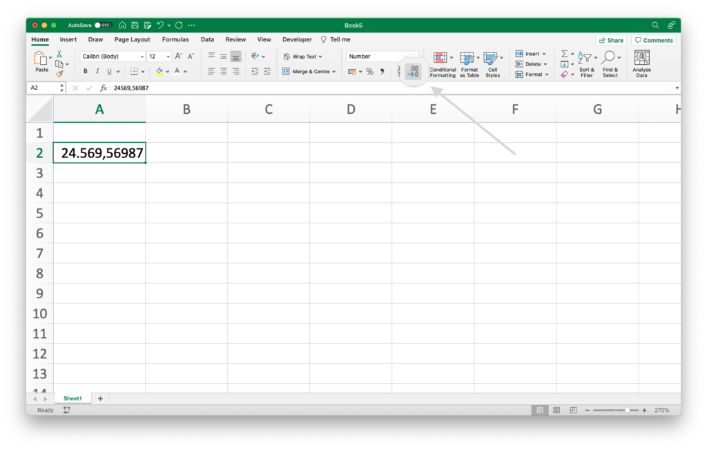 Klikajte taj znak (decrease decimal) dok ne dođete na željeni broj decimala ili dok ne zaokružite broj bez decimala.