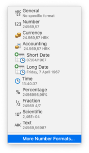 Idite na Home, zatim General (padajući izbornik gdje mijenjamo format broja, prikazano na slici desno), odaberite More Number Formats… te kliknite na Decimal places.