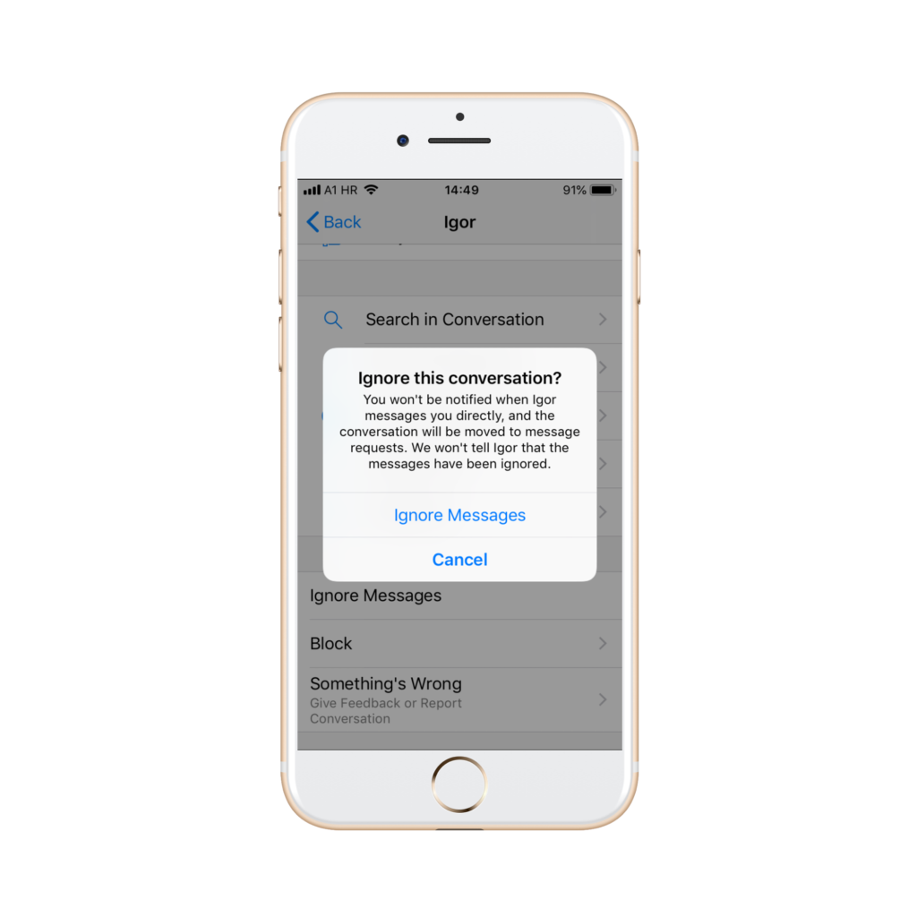 Potvrdom dobivate poruku kako je osoba blokirana te da, ukoliko se predomislite, blokiranim porukama možete pristupiti kroz listu filtriranih poruka (Filtered Messages list).