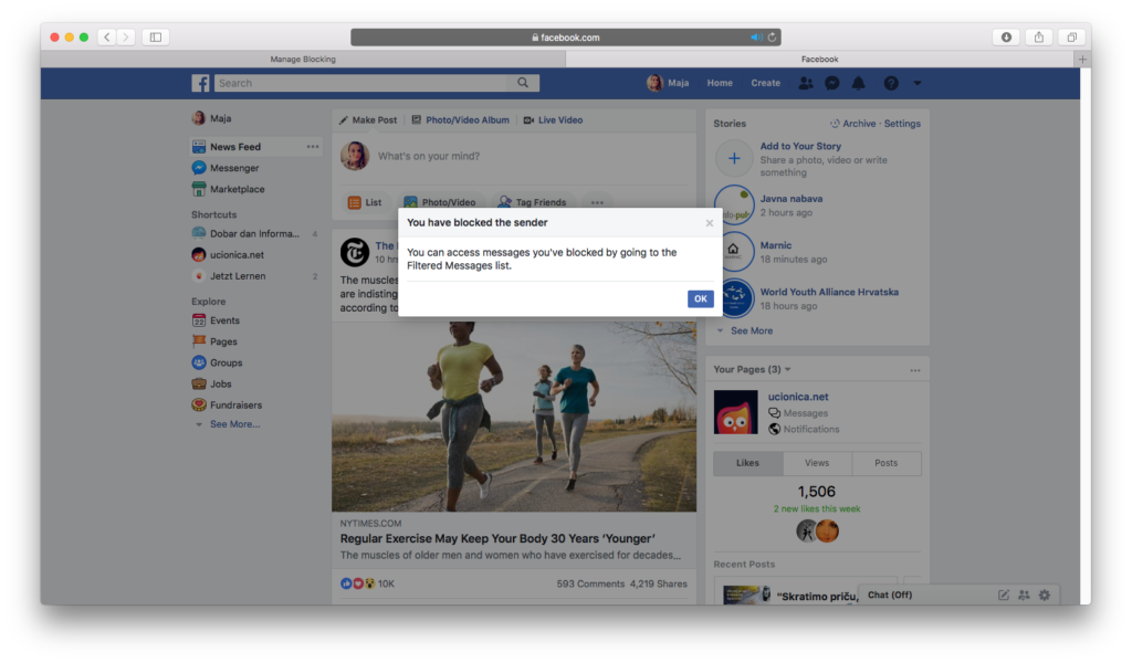Pritiskom na gumb OK ste završili s blokiranjem osoba. Više nećete primati poruke od blokiranih osoba i isti više neće biti u mogućnosti vidjeti vaše objave odnosno postove.