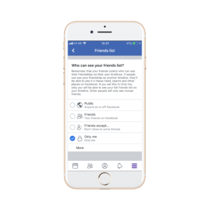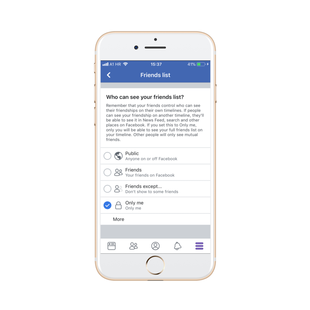 Popis može biti javan (vidljiv svima koji pristupe vašem profilu – Public), mogu ga vidjeti samo vaši Prijatelji (Friends), može biti vidljiv isključivo vama (Only me) te možete odabrati zasebnu prilagođenu verziju (Custom). Ukoliko želite da popis vaših Prijatelja bude vidljiv samo vama i skriven od svih, odaberite Only me.
