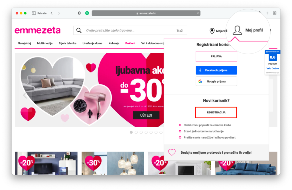U gornjem desnom kutu stranice odaberite ikonu Moj profil pa kliknite Registracija.