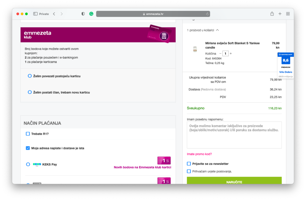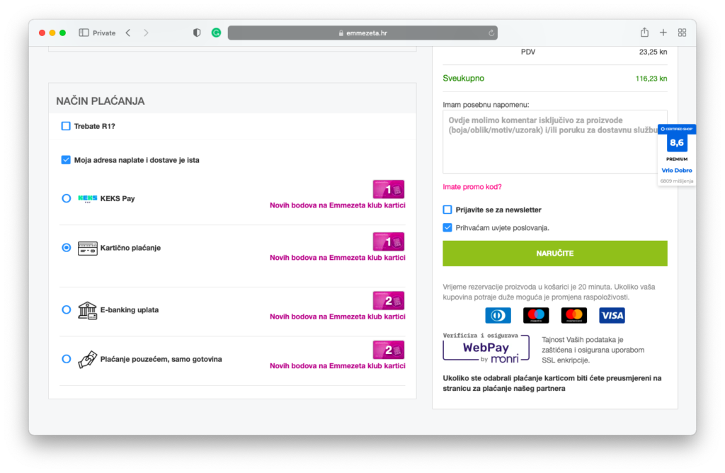 Odaberite željeni način plaćanja, stavite kvačicu na Prihvaćam uvjete poslovanja i kliknite Naručite.