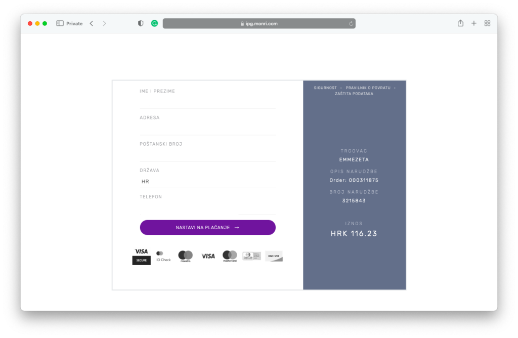 Nastavite na plaćanje, unesite broj kartice i ostale tražene podatke, odaberite dostupan broj rata i potvrdite plaćanje pritiskom na Plati.