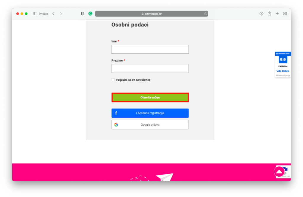 Za prijavu unesite e-mail adresu, osmislite lozinku, zatim unesite ime i prezime te pritisnite zeleni gumb otvorite račun.