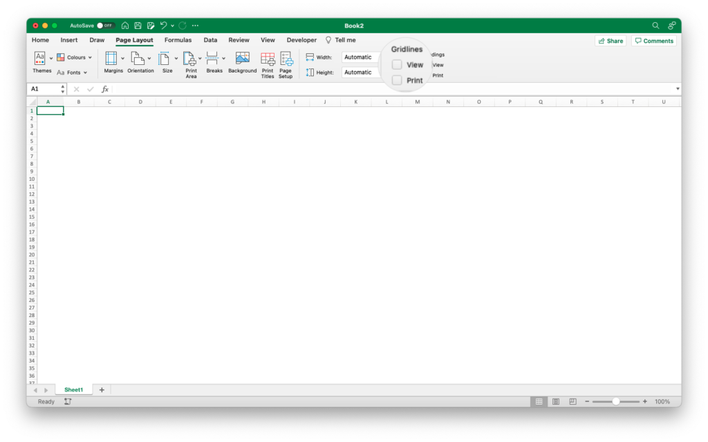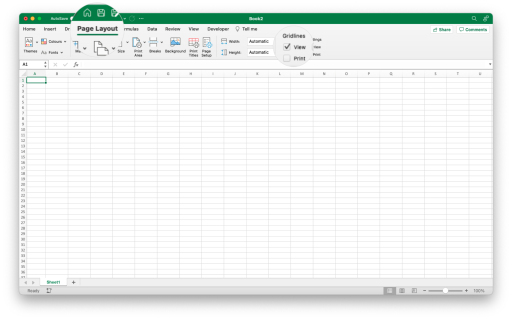Za micanje rešetki u Excelu idite na tab Page Layout koji se nalazi u gornjoj alatnoj traci.