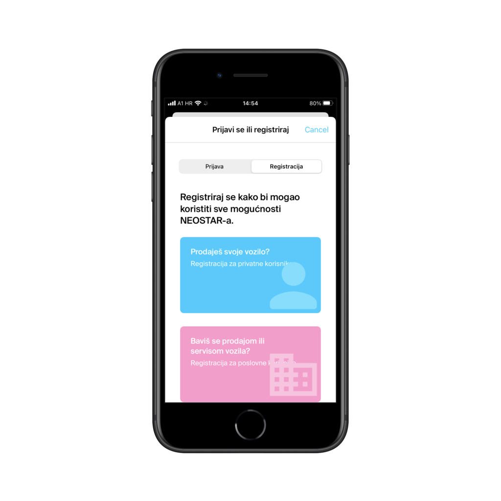 Za registraciju na Neostar rabljena vozila odaberite Profil te kliknite Registracija te odaberite jeste li privatni ili poslovni korisnik.