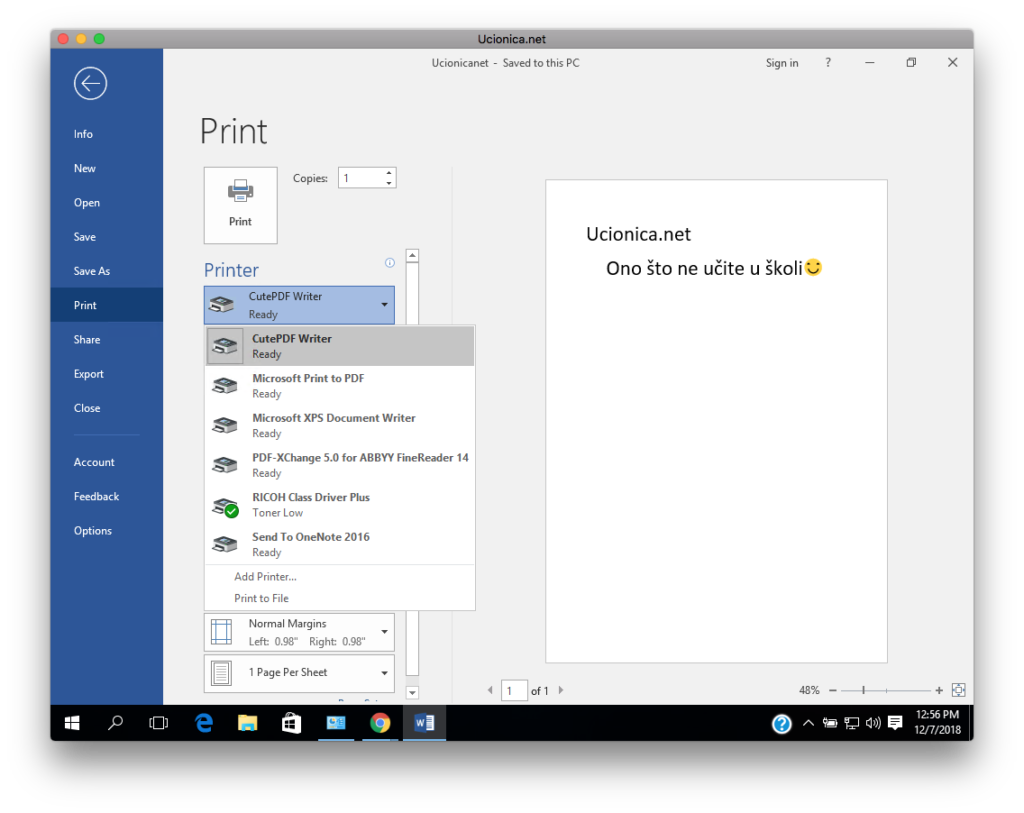 Kliknite na “File” (datoteka) u gornjem lijevom kutu, pa pod odjeljkom “Print” (ispis) odaberite “CutePDF Writer” kao printer i kliknite na “Print” (ispis).