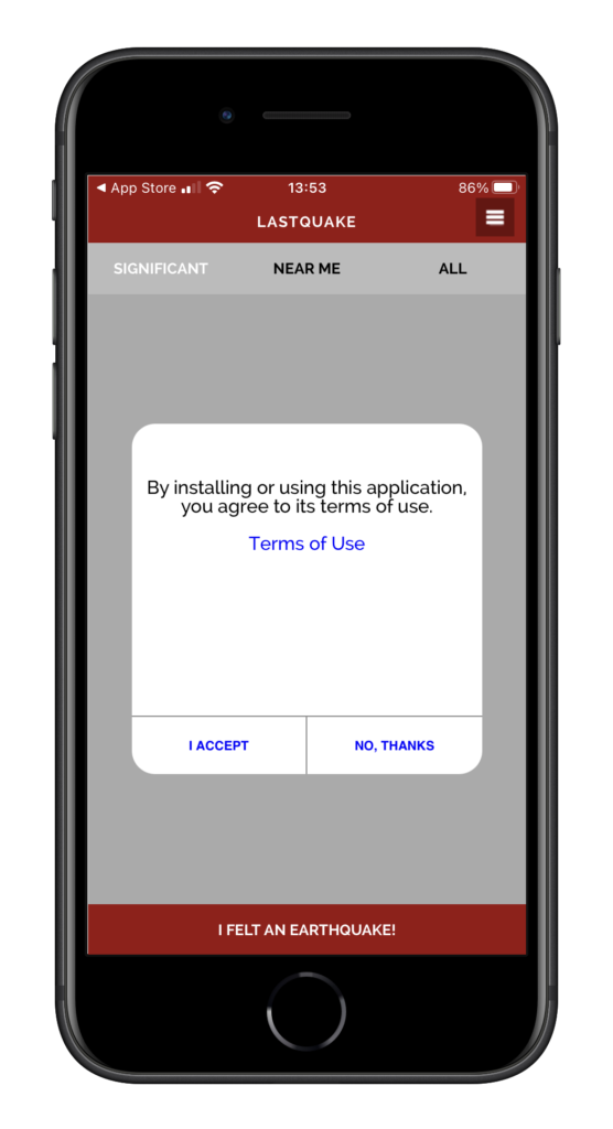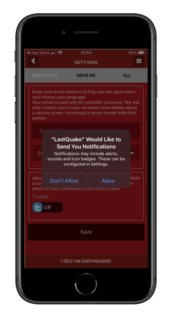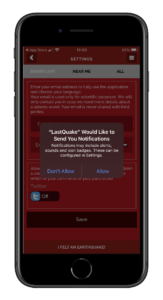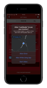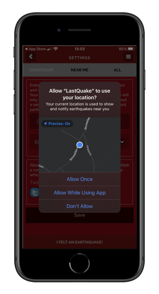 Također ćete biti upitani želite li omogućiti prikazivanje obavijesti kada se dogodi novi potres u vašem području + želite li omogućiti aplikaciji pristup vašim geolokacijskim podacima, odnosno da aplikacija zna gdje se nalazite putem GPS-a kako bi pottencijalne obavijesti o potresima bili što relevantniji za vas.