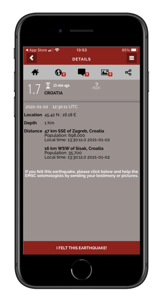 Osim informacija o potresu kao što su lokacija, jačina po magnitudnoj ljestvici (Richterova ljestvica), možete unijeti vlastita iskustva i kako ste doživljeli određeni potres. Također možete pregledati iskustva drugih korisnika aplikacije s pratećim slikama.