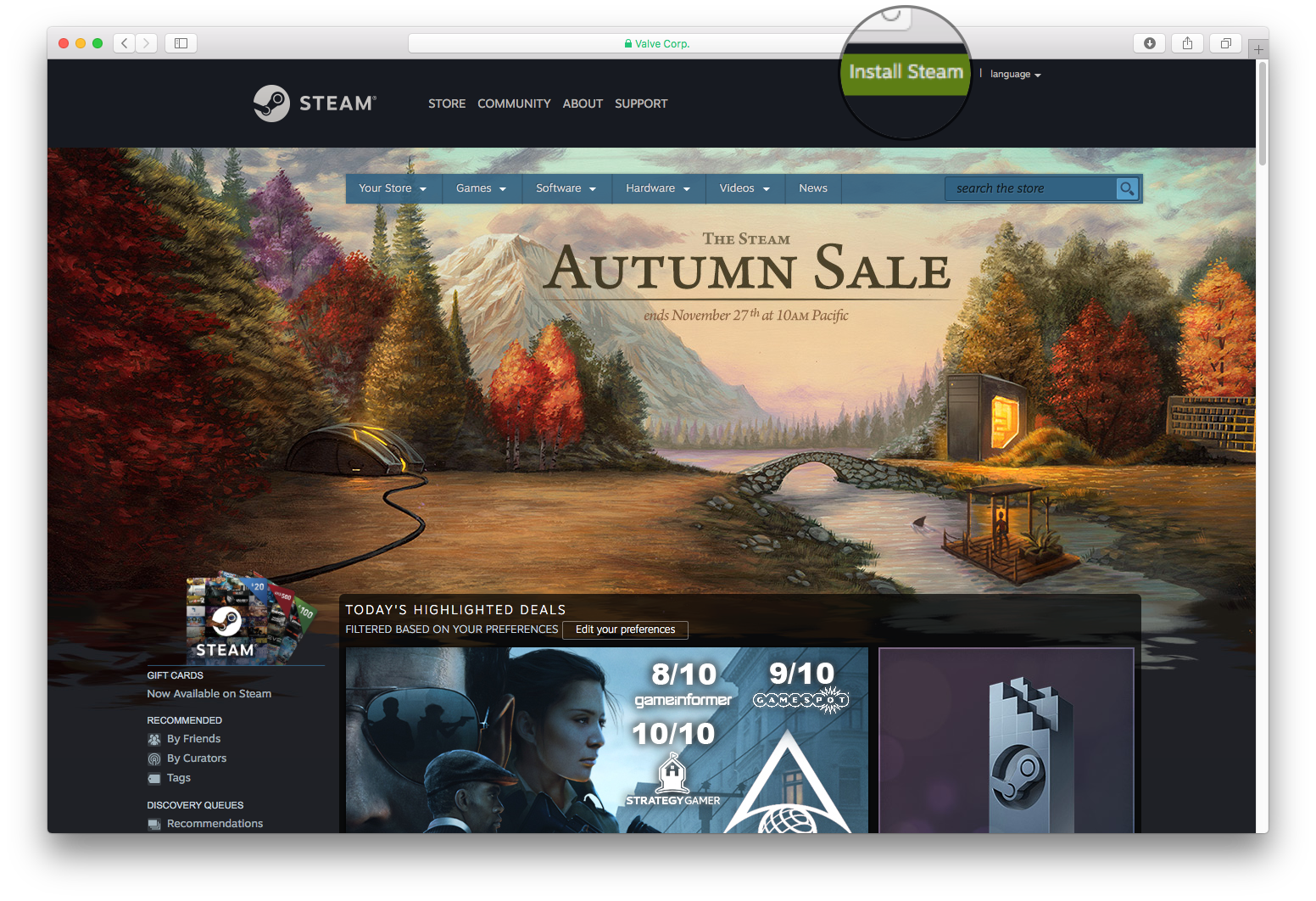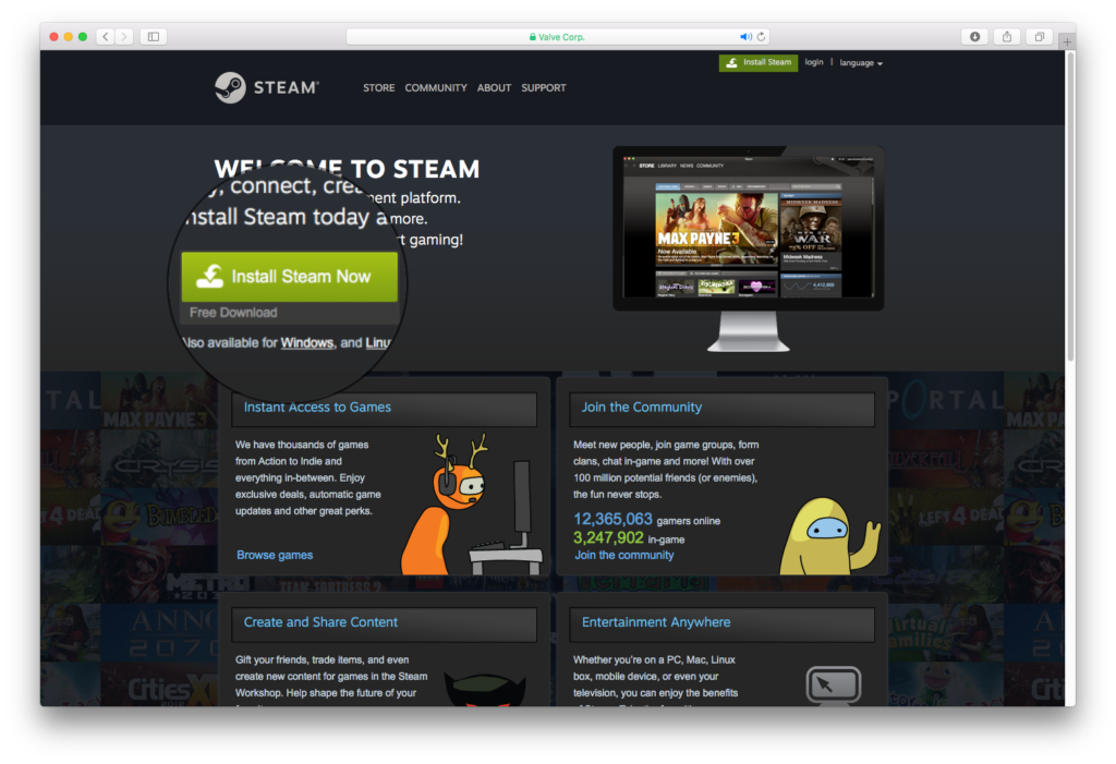 Prva stvar koju moramo napraviti je otići na web stranicu store.steampowered.com. U gornjem desnom kutu pritisnite na Install Steam (Instaliraj Steam).