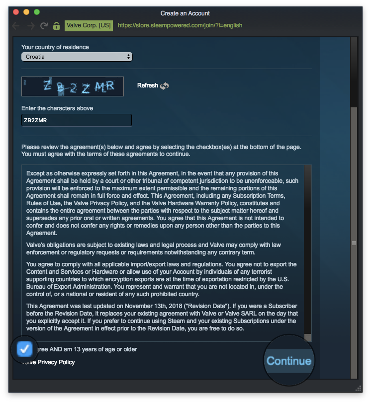 Zatim u ekranu koji vam se otvara unesite e-mail adresu kojoj imate pristup, kontrolna slova i brojeve, te potvrdite kvačicom kako ste stariji od 13 godina i stisnite Continue (Nastavi).