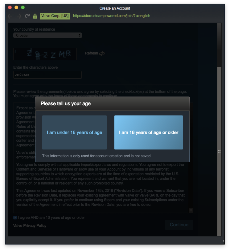 Steam će vas pitati u koju dobnu skupinu spadate pa označite kojoj pripadate.