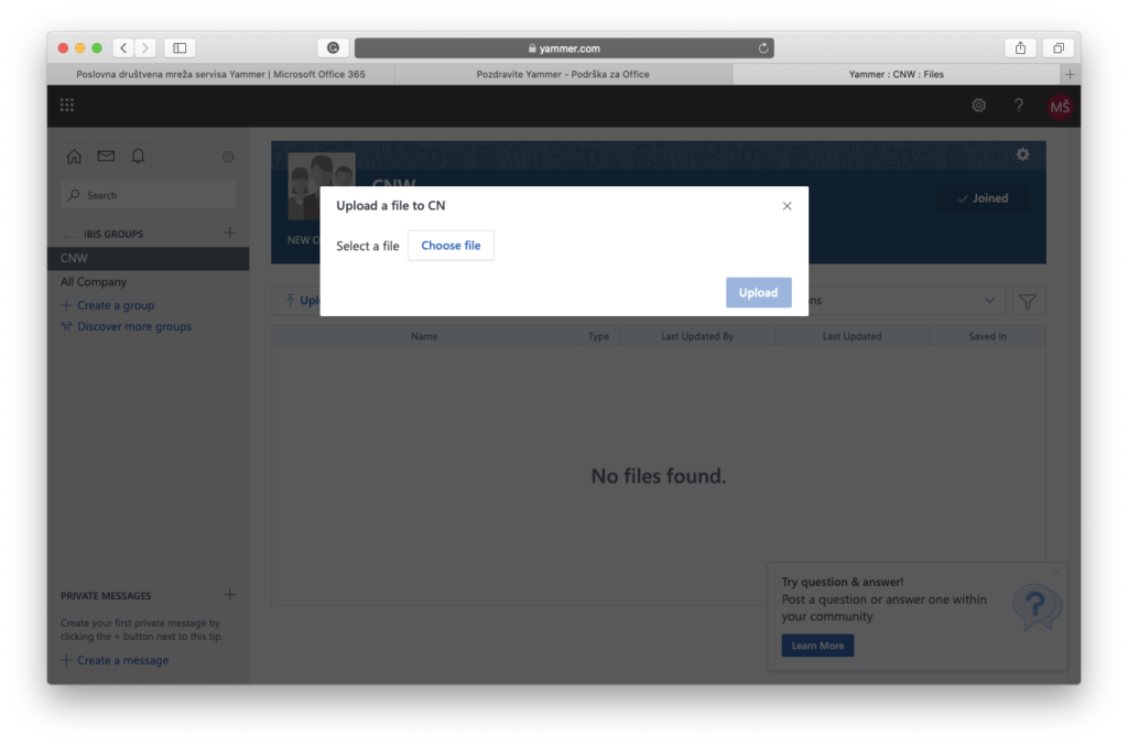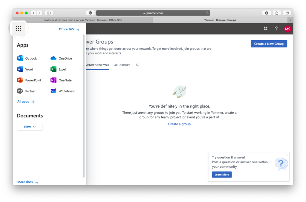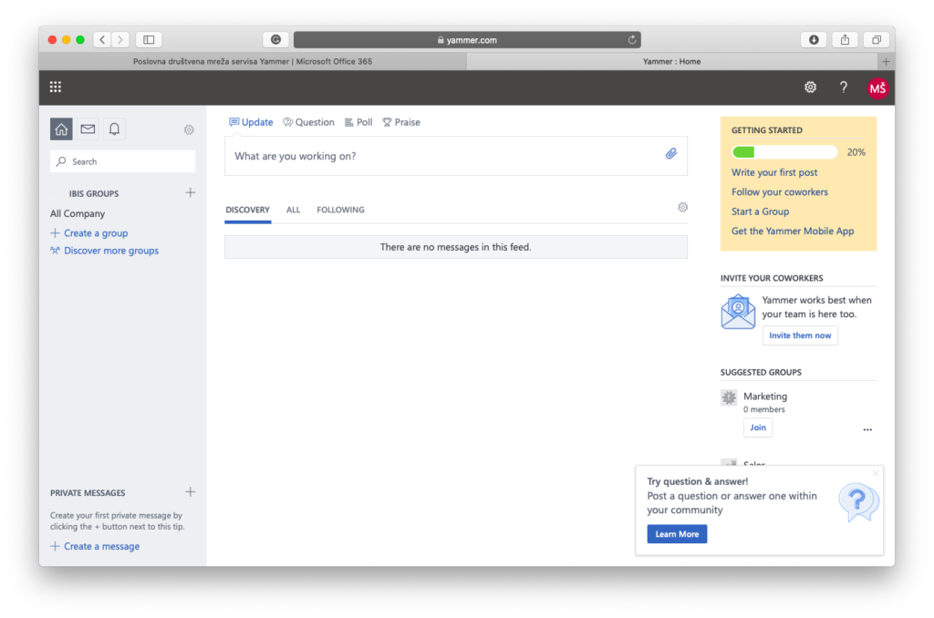 Prijavom u Yammer automatski postajete član grupe svoje tvrtke ili organizacije, a one su odličan način za obavljanje timskih zadataka i informiranje o određenim temama u “real timeu”.