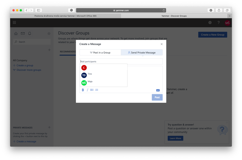 Pisanje i slanje poruka (Create a message) je vrlo jednostavno, a možete slati generalno na cijelu grupu ili dediciranim pojedincima putem privatne poruke.