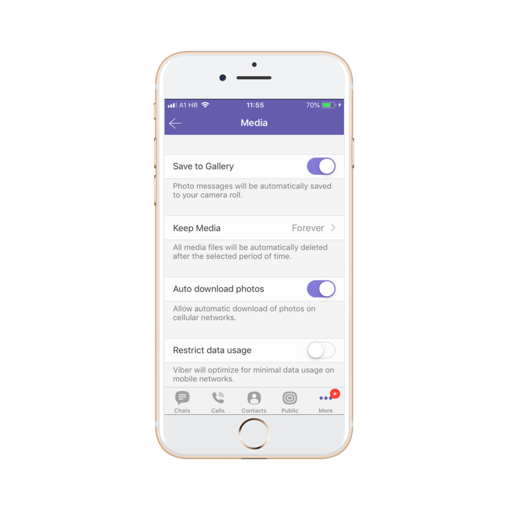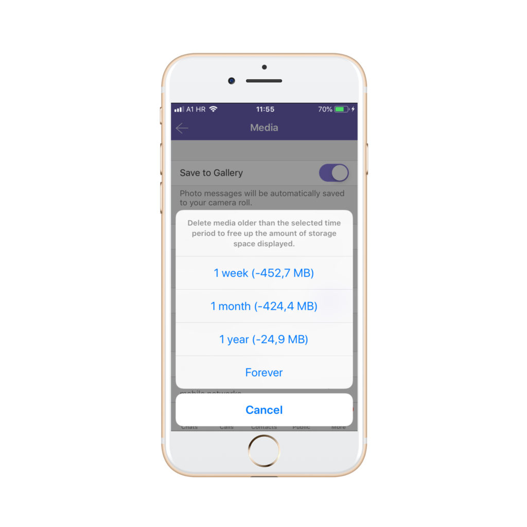 Ako želite spriječiti Viberovo spremanje fotografija u galeriju vašeg mobilnog uređaja, odznačite Save to Gallery (Spremi u Galeriju) tako da bude sivo.