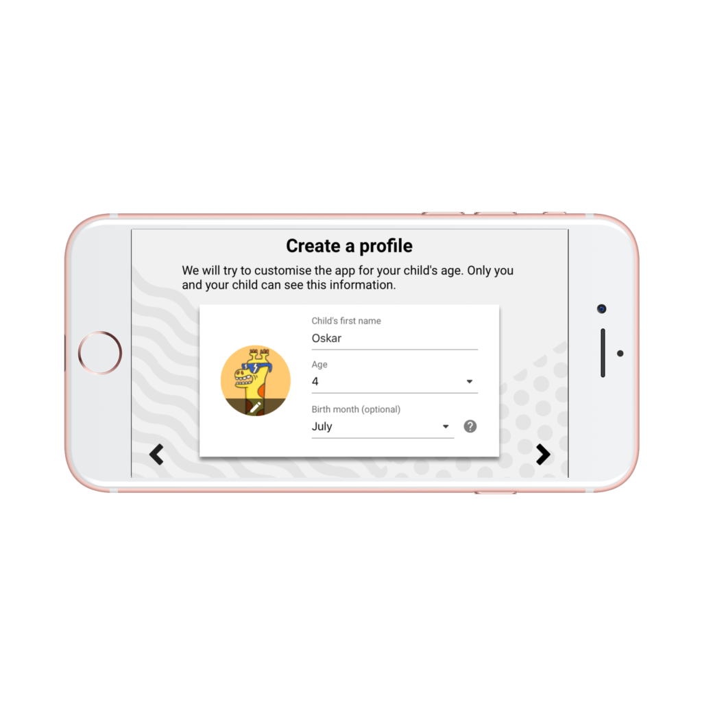 U prvo polje upišite djetetovo ime, zatim dob i, opcionalno, mjesec rođenja te pritisnite strelicu u donjem desnom dijelu ekrana.