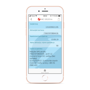 U SMS upisujete 14-znamenkasti broj vouchera s bona ili iz mZabe (aktivacijski kod bona), upišete povlaku (–) i broj vašeg ENC uređaja.