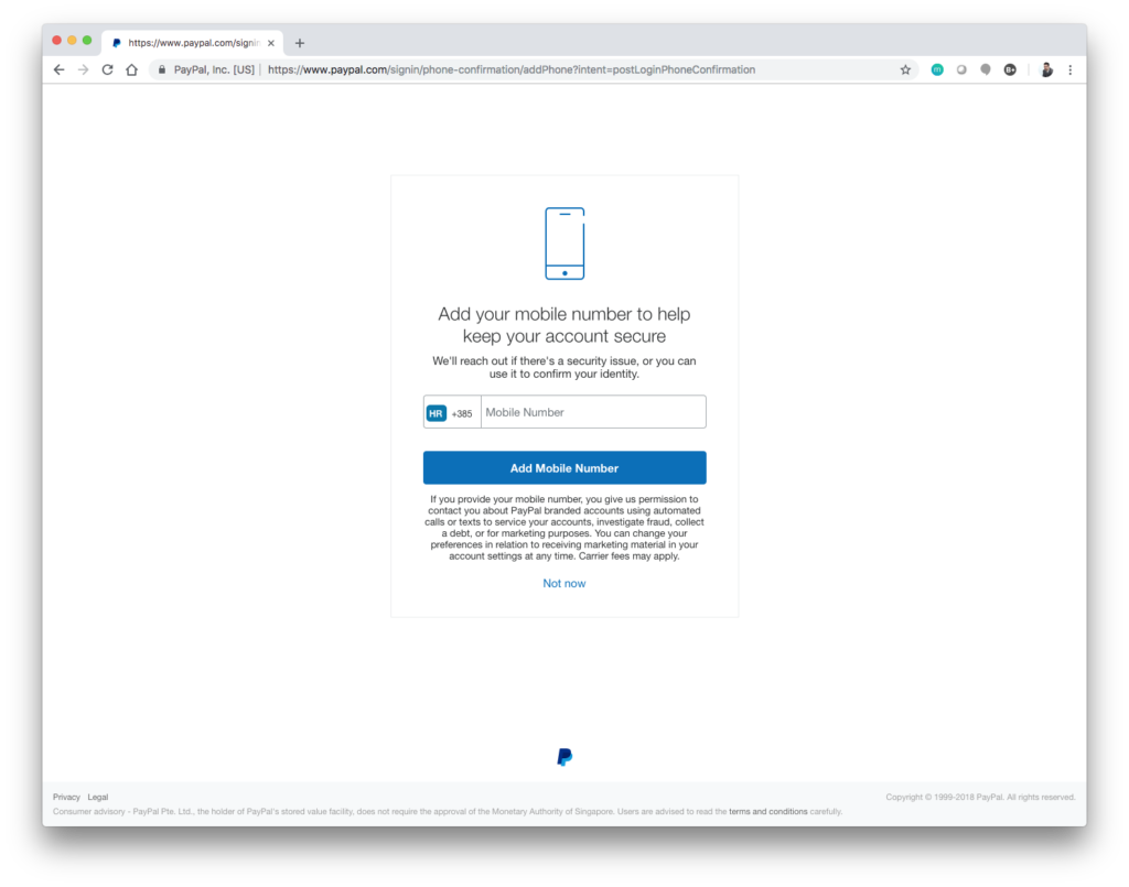 Dodatno, u slučaju da vam se prikaže obavijest o povezivanju moilnog broja sa svojim PayPal korisničkim računom, slobodno preskočite odabirom “Not now” (Ne sada).