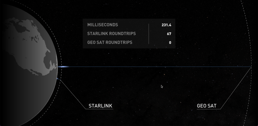 Starlink je u puno nižoj (bližoj) orbiti Zemlje – oko svega 500 kilometara te time omogućuje brz odaziv i propusnost internetske veze. Kada u tu jednadžbu dodate činjenicu da postoje već tisuće Starlink satelita za internet, onda dobivate dosta kvalitetnu vezu.