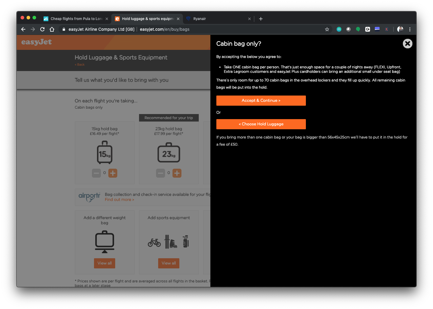 U sljedeća dva koraka odaberite gdje biste željeli sjediti u avionu (Continue za nastavak) i nosite li uz uključenu prtljagu (kabinska prtljaga) ikakvu dodatnu, odnosno veću ili težu.