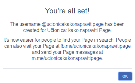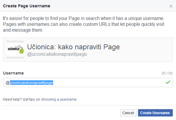 Vaša stranica, odnosno Page, mora imati svojevrsno korisničko ime. Pritiskom na „Create Page @username“, otvorit će vam se izbornik za upis imena. Odaberite ime kako bi vas korisnici lakše pronalazili prilikom upisa u Facebook tražilicu.
