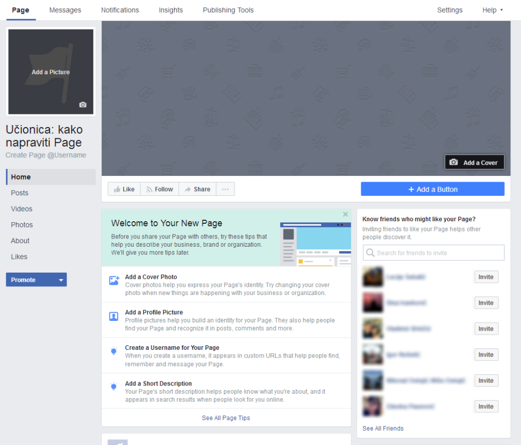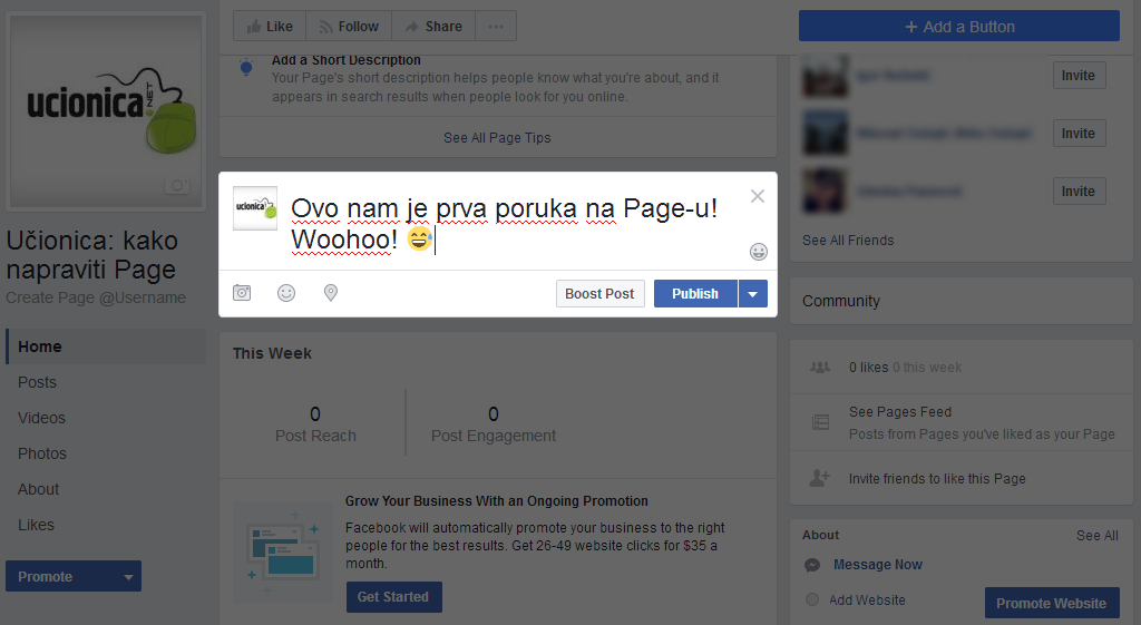 Dodatno, već na ovom koraku administrator stranice može pozvati sve svoje prijatelje da likeaju njegovu stranicu, u desnom stupcu pod Invite (Pozovi).