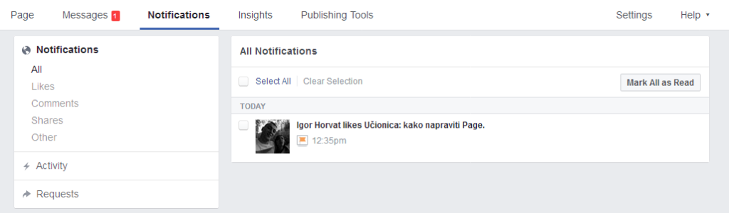 Notifications (Obavijesti) prikazuje obavijesti o događajima na stranici, poput objava, količine likeova, kada je netko napravio share vaše objave ili like vaše slike itd.