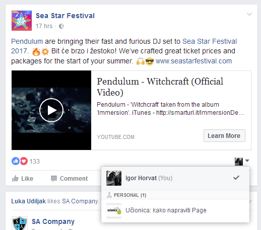 Ono što se često događa kada ste vlasnik neke od stranica, je da želite likeati druge stranice kao vaša stranica, a ne kao vi osobno. Postupak je jednostavan, kod objava koje želite likeati se nalazi padajući izbornik s opcijom da to odradite u ime vaše stranice.