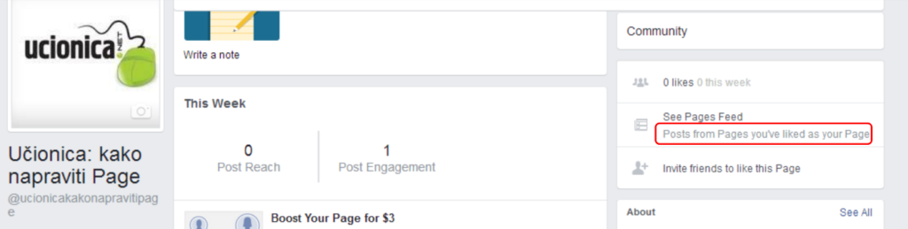 Za pregled postova koje ste likeali kao vaša stranica, kliknite u desnom izborniku stranice „Posts from Pages you’ve liked as your Page“.