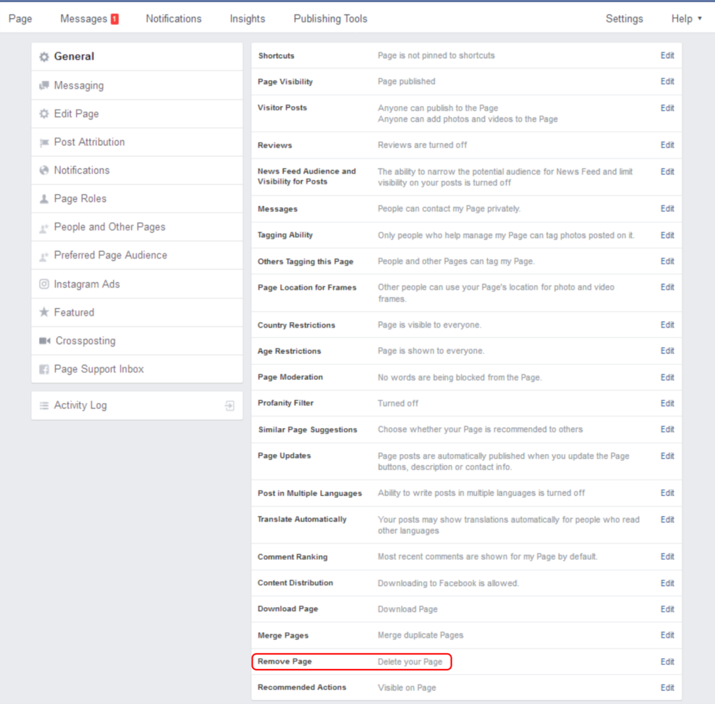 Kliknite na tipku Settings (Postavke), zatim General (Općenito). U dnu opcija se nalazi tipka Remove Page (Izbriši stranicu), pritiskom na nju izbrisat ćete u potpunosti vašu stranicu.