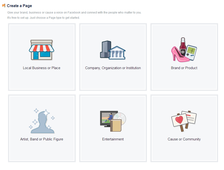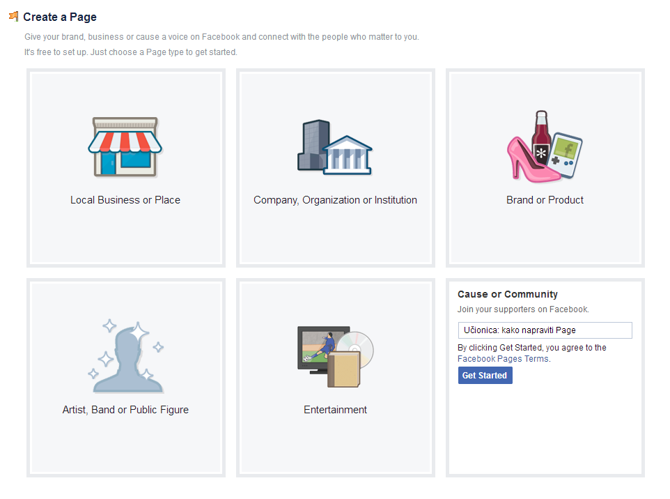 Naslovna stranica za kreiranje vam nudi 6 vrsta stranica u ovisnosti o tome u koju svrhu kreirate Page (Stranicu), odnosno za kakav tip poslovanja ili interesa. Odaberite tip stranice koji najbolje pristaje uz vaše polje interesa.