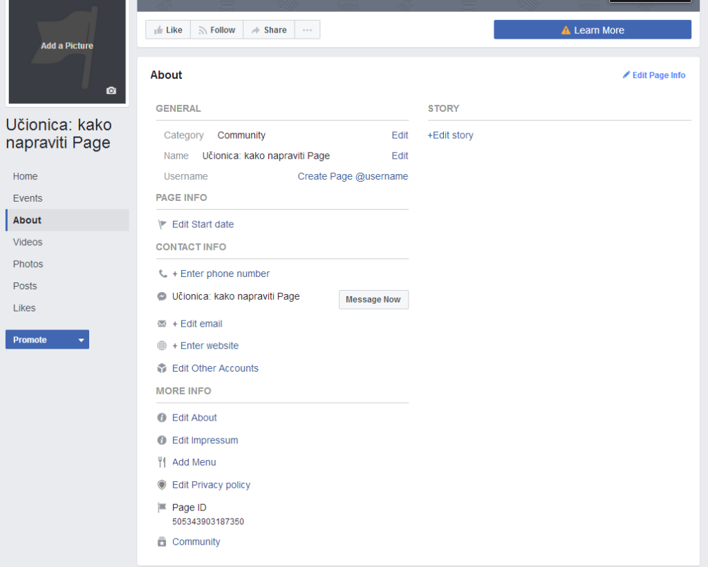 Klikom na tipku About, otvorit će vam se izbornik u koji je potrebno upisati podatke o vašoj stranici, odnosno o tvrtki, osobi ili projektu kojem služi ovaj Page.