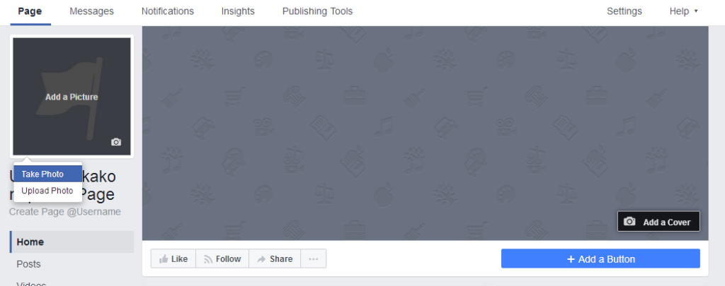 Postavite profilnu sliku pritiskom na ikonicu fotoaparata koja se nalazi na praznoj profilnoj slici. Možete odabrati dva načina za postavljanje, Take Photo (Snimi fotografiju) za snimanje fotografije uređajem na kojem kreirate Page, ili pritiskom na Upload Photo (Učitaj fotografiju) tako što ćete postaviti fotografiju koju ste unaprijed pripremili.