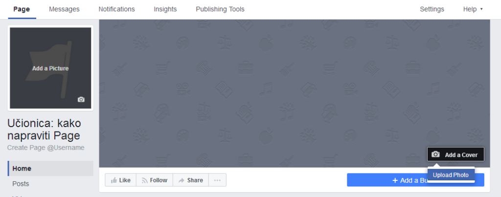 Facebook je sada za vas kreirao stranicu, koja je inicijalno potpuno prazna, bez ispunjenih elemenata. U lijevom stupcu vidimo profilnu sliku, ispod koje se nalaze izbornici: Home, Posts, Videos, Photos, About, Likes.