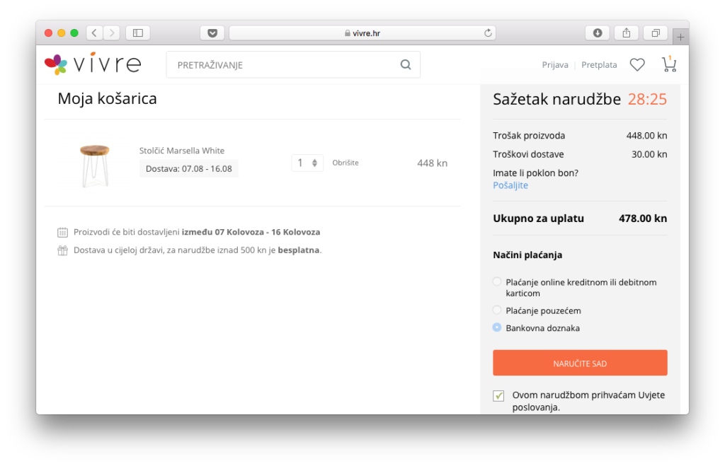 Nakon odabira proizvoda, kliknite na oznaku košarice u gornjem desnom uglu. Pregledajte proizvode, količine, ukupno vrijeme dostave i trošak narudžbe. Zatim odaberite način plaćanja i prihvatite uvjete poslovanja.