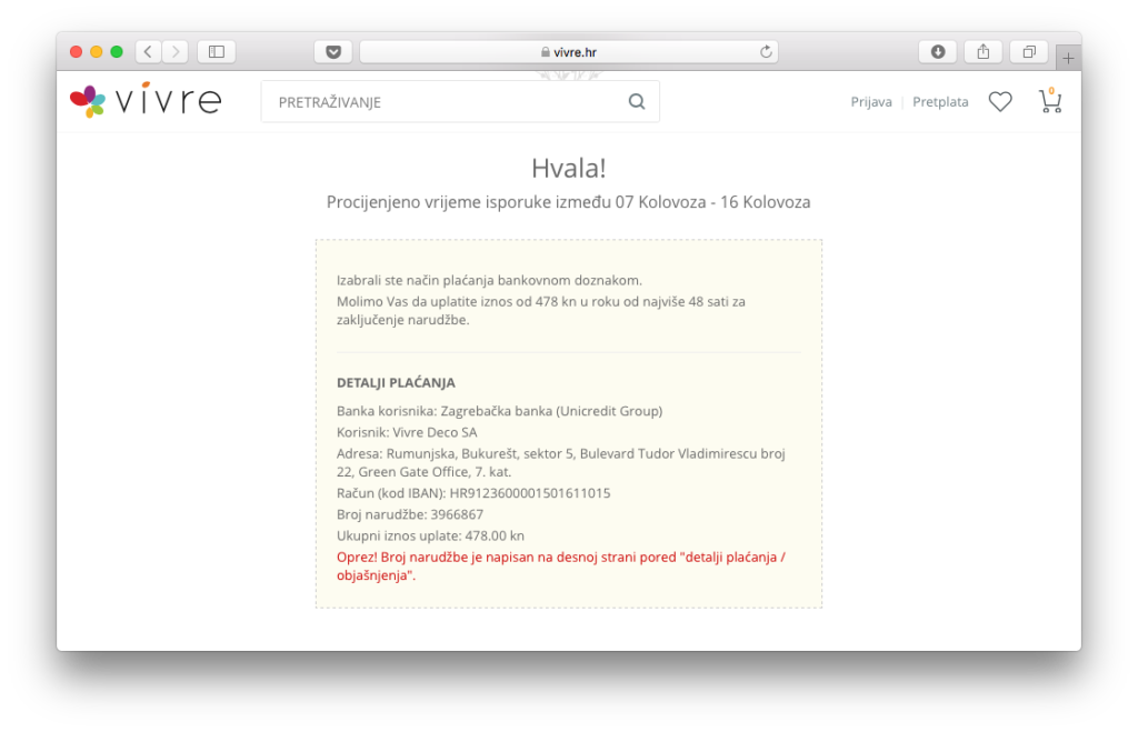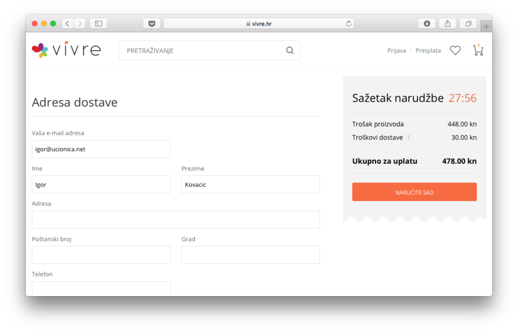 Na kraju unesite osobne podatke za dostavu i potvrdite narudžbu. Na ekranu će se prikazati potvrda, a sažetak narudžbe će također stići i na email adresu.