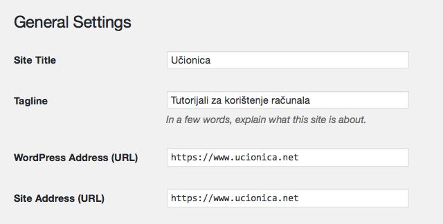 Pod Settings > General izmijenite WordPress Address (URL) i Site Address (URL) u verzije koje sadrže https.