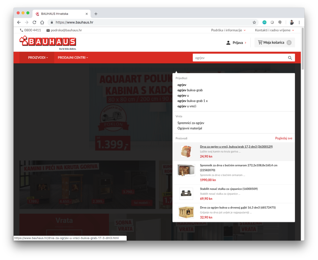 U svom omiljenom Internet pretraživaču posjetite Bauhaus web stranicu bauhaus.hr , te u pretraživanje upišite traženi proizvod, a sustav će vam odmah ponuditi moguće rezultate tijekom upisivanja – kliknite na proizvod.