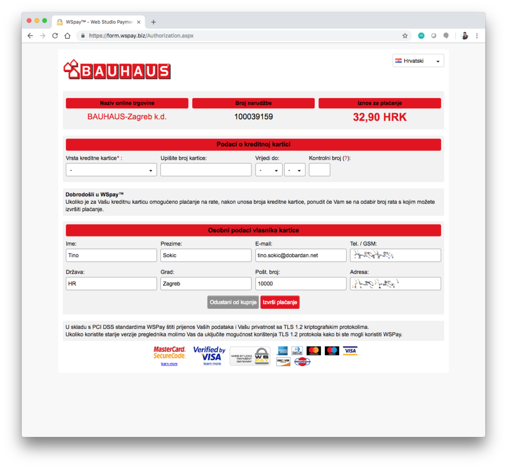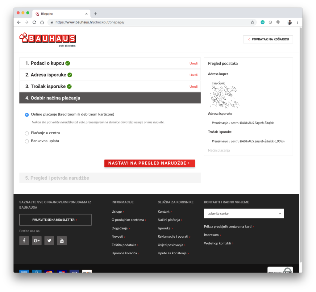Najbrže plaćanje ćete izvršiti putem Online plaćanja kreditnom ili debitnom karticom. Dodatne vrste plaćanja su plaćanje u centru pri preuzimanju robe ili bankovnom uplatom, ali je bankovna uplata najsporiji način dok se proknjiži u svim bankovnim sustavima. Mi smo odabrali Online plaćanje karticom.
