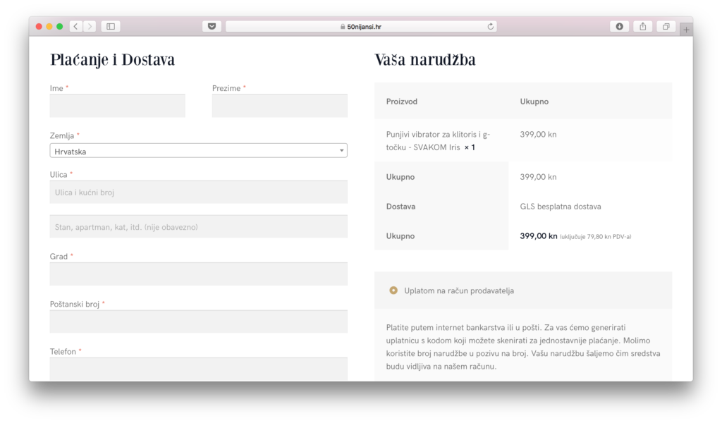 50nijansi.hr ne sprema korisničke podatke već je kupnju moguće napraviti bez registracije i prijave – kao gost. Nakon izvršene dostave, podaci se brišu.
