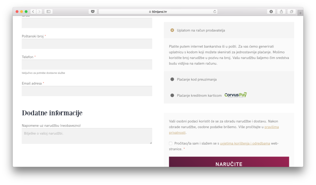 U ovisnosti o odabranom načinu plaćanja ćete još trebati ispuniti primjerice broj kartice ako ste odabrali kreditne kartice.