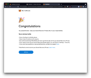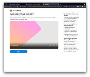 - Nakon izrade lozinke predlažemo da pogledate kratak video kako dodatno osigurati svoj Metamask novčanik uz pomoć korištenja dodatnih fraza/riječi za oporavak računa (eng. secret recovery phrase), te odaberite dalje (eng. next) za nastavak.
