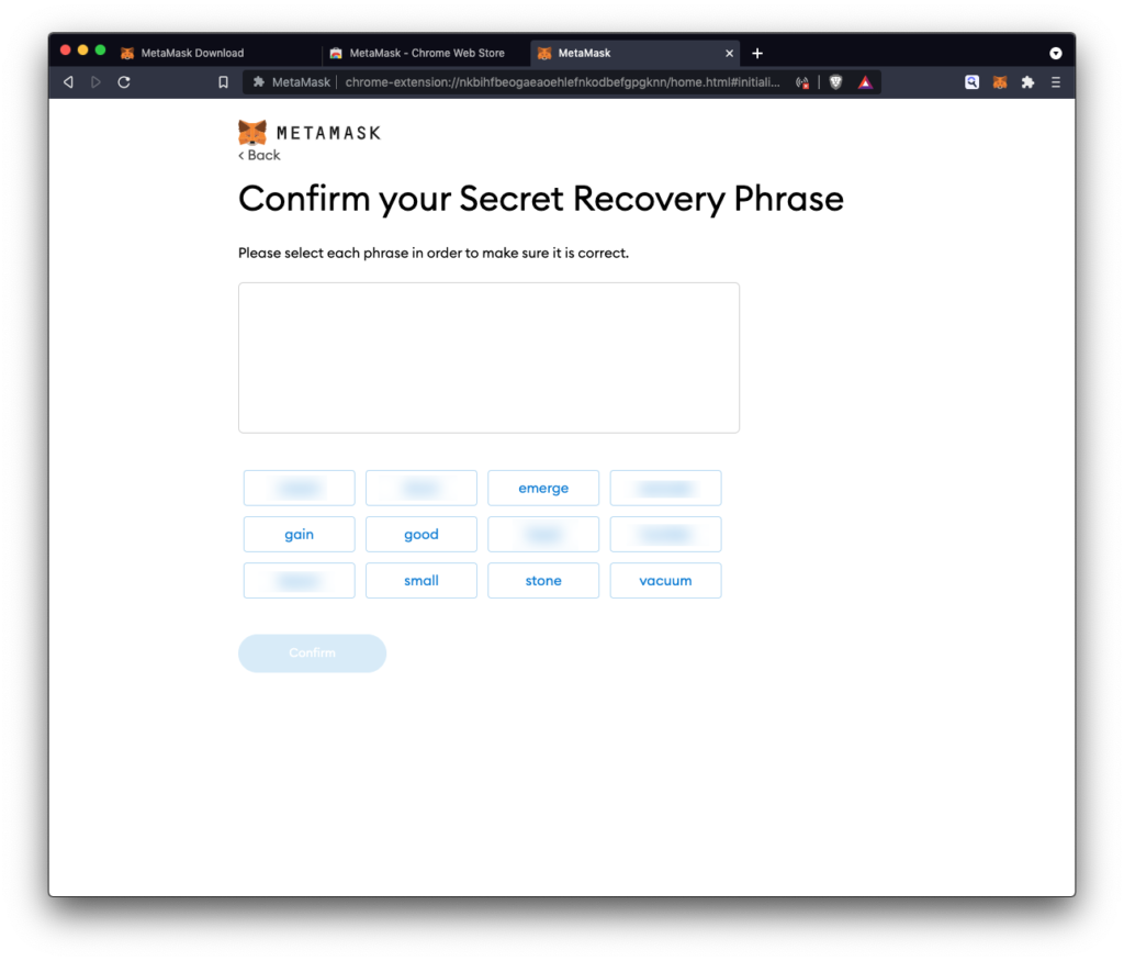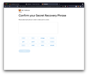 - U sljedećem koraku prikazane su vaš skup riječi za oporavak – obvezno ih upišite prema redoslijedu koji je prikazan, jer uz pomoć njih moći ćete pristupiti novčaniku u slučaju da izgubite pristup (npr. zaboravljena lozinka). Odaberite dalje (eng. next) za nastavak.