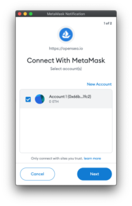 - Kako biste mogli obaviti kupnju, povežite svoj novčanik s trgovinom opensea.io – opcija gore desno>My Wallet>Metamask.