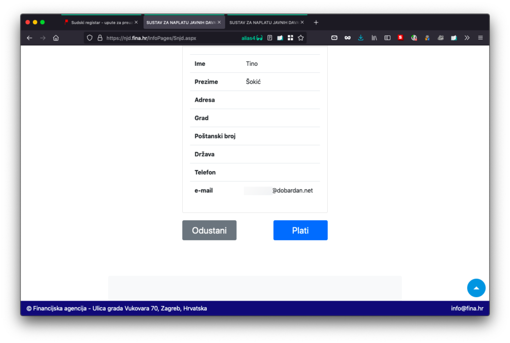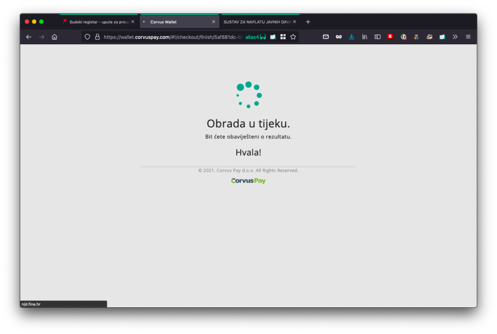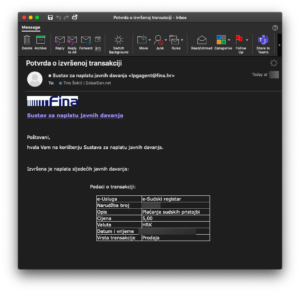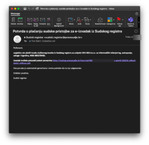 Uz to, stići će vam i e-mail poruka s potvrdom o plaćanju sudske pristojbe te navedenom poveznicom za preuzimanje e-izvatka, kao i potvrda o provedenoj transakciji od sustava za naplatu javnih davanja.